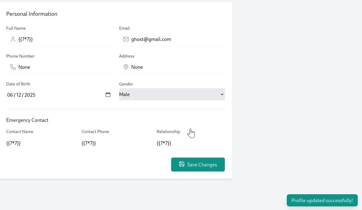 after registering with valid name ghost , we noticed that the application allows us to update our name and another fields without any sanitization , so we can inject the payload {{7*7}}