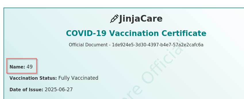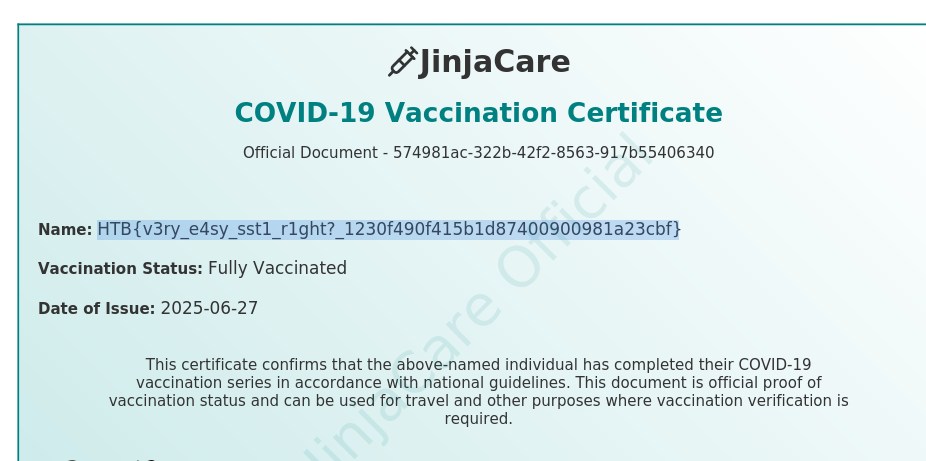 Jinjacare is a web application designed to help citizens manage and access their COVID-19 vaccination records. The platform allows users to store their vaccination history and generate digital certificates. They’ve asked you to hunt for any potential security issues in their application and retrieve the flag stored in their site.