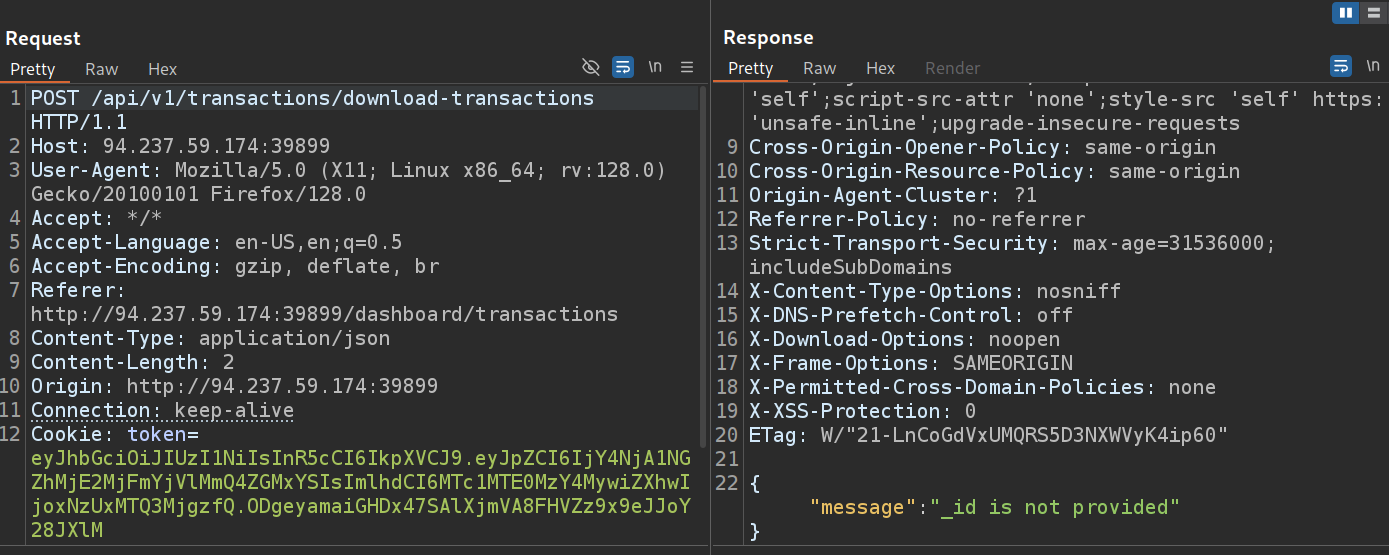 This web application is vulnerable to IDOR with exploit the MongoDB Object IDs Prediction which allows us to discover other users Ids and with IDOR can read their transaction