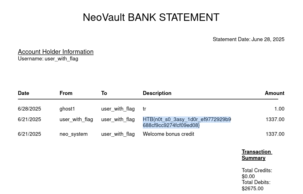Neovault is a trusted banking application that allows users to effortlessly transfer funds to one another and conveniently download their transaction history. We invite you to explore the application for any potential vulnerabilities and uncover the flag hidden within its depths.