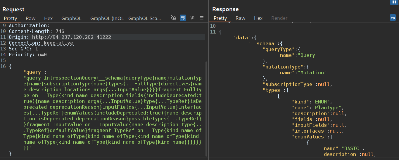 we can perform GraphQL introspection to retrieve the information about its schema, by sending the payload :
