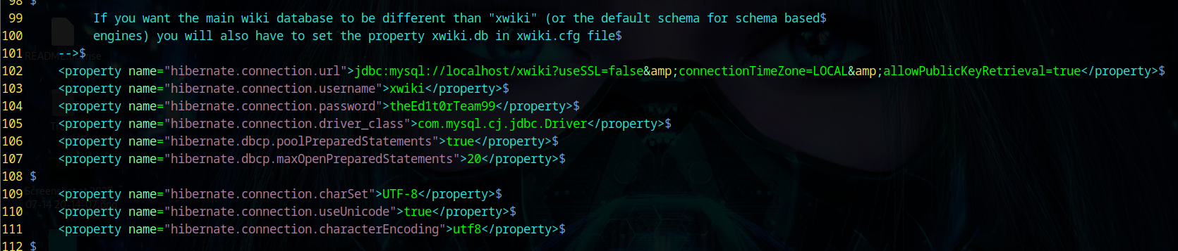/usr/lib/xwiki-jetty/webapps/xwiki/WEB-INF/hibernate.cfg.xml, I found a passwords